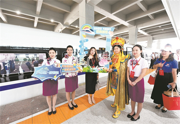 “流線(xiàn)型的白色車(chē)身,寬敞舒適的座椅,干凈整潔的行李架,專(zhuān)業(yè)、熱情、細致的服務(wù),以及變臉、茶藝、歌曲舞蹈等豐富多彩的節目,給我帶來(lái)了太多驚喜,感謝鐵路讓我度過(guò)了一段美好旅程?!甭每吞飸c云高興地說(shuō)。